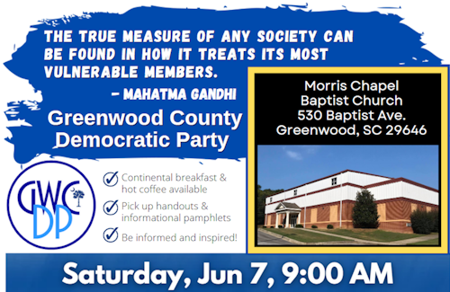 Join us this Saturday morning at 9 am for our monthly Breakfast Meeting where you will get updates on everything happening with the Greenwood Democrats plus a chance to hear directly from US Senate Candidate Lee Johnson!